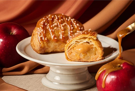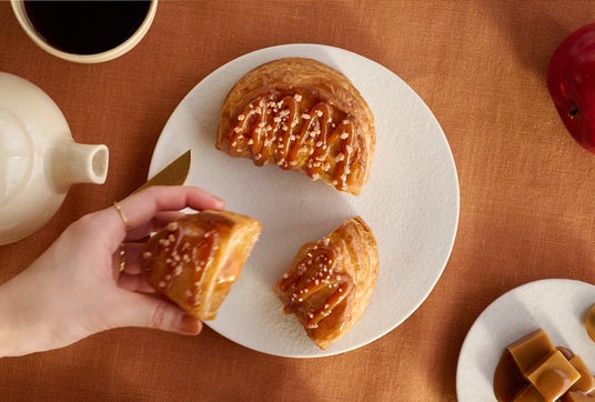 「焼きたてカスタードアップルパイ ダブルキャラメル」は、コク深いキャラメルの味わいにとろけるアップルパイ。キャラメルカスタードクリームの甘さに、ほろ苦いキャラメルソースの味わいが重なった“ダブル”キャラメルのハーモニーをお楽しみいただけます。