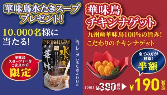 期間中、華味鳥スターフォーをご注文すると抽選で1万名様に水たきスープをプレゼント!(ご当選の方には、商品と一緒に当選券をお渡しします。詳細は券面をご確認ください)
