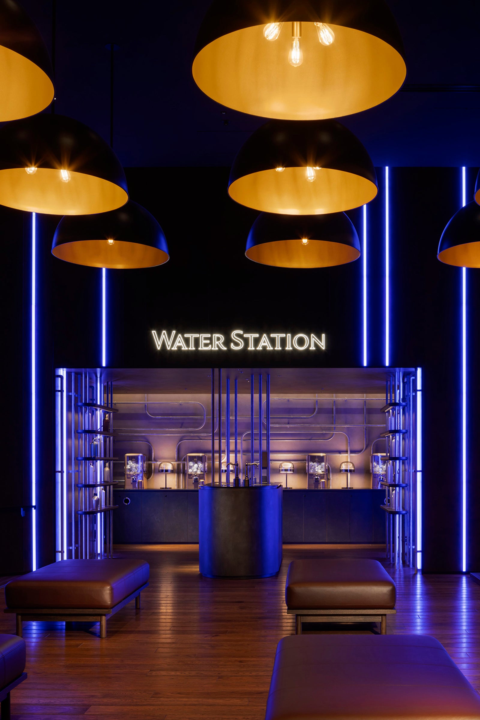 ロビー中央の駅前広場に見立てたステーションスクエアには、往時の駅や列車内にも見られた「ふるまい水」の文化を進化させたウォーターステーションが佇む。自由に水を汲み、給水できる新空間が訪れる人々を癒す。