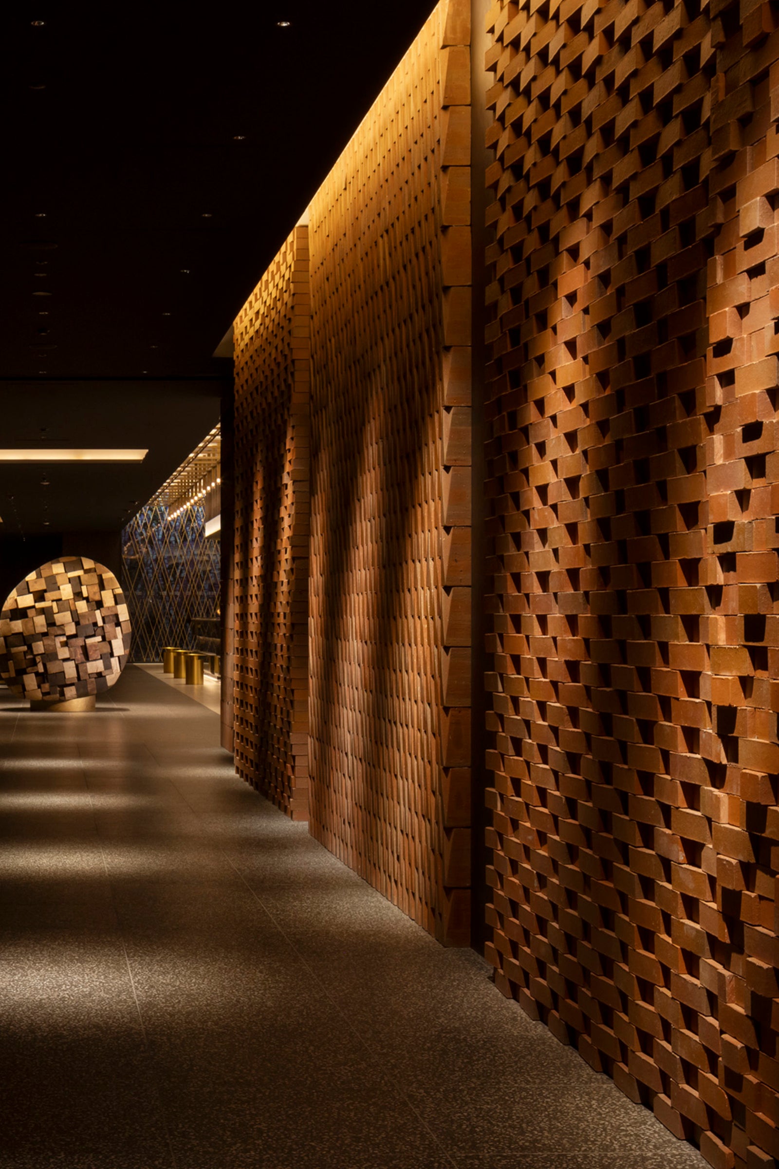 29階エレベーターホールから続く、初代大阪駅舎を彷彿させる「ブリックアート」の回廊。唯一無二の表現を試みた「時空の旅」を象徴するキーマテリアルの煉瓦素材。先に進むとかつての線路の木製枕木に着目し、鋏こんをデザインに取り入れたウェルカムアートがゲストを出迎える。