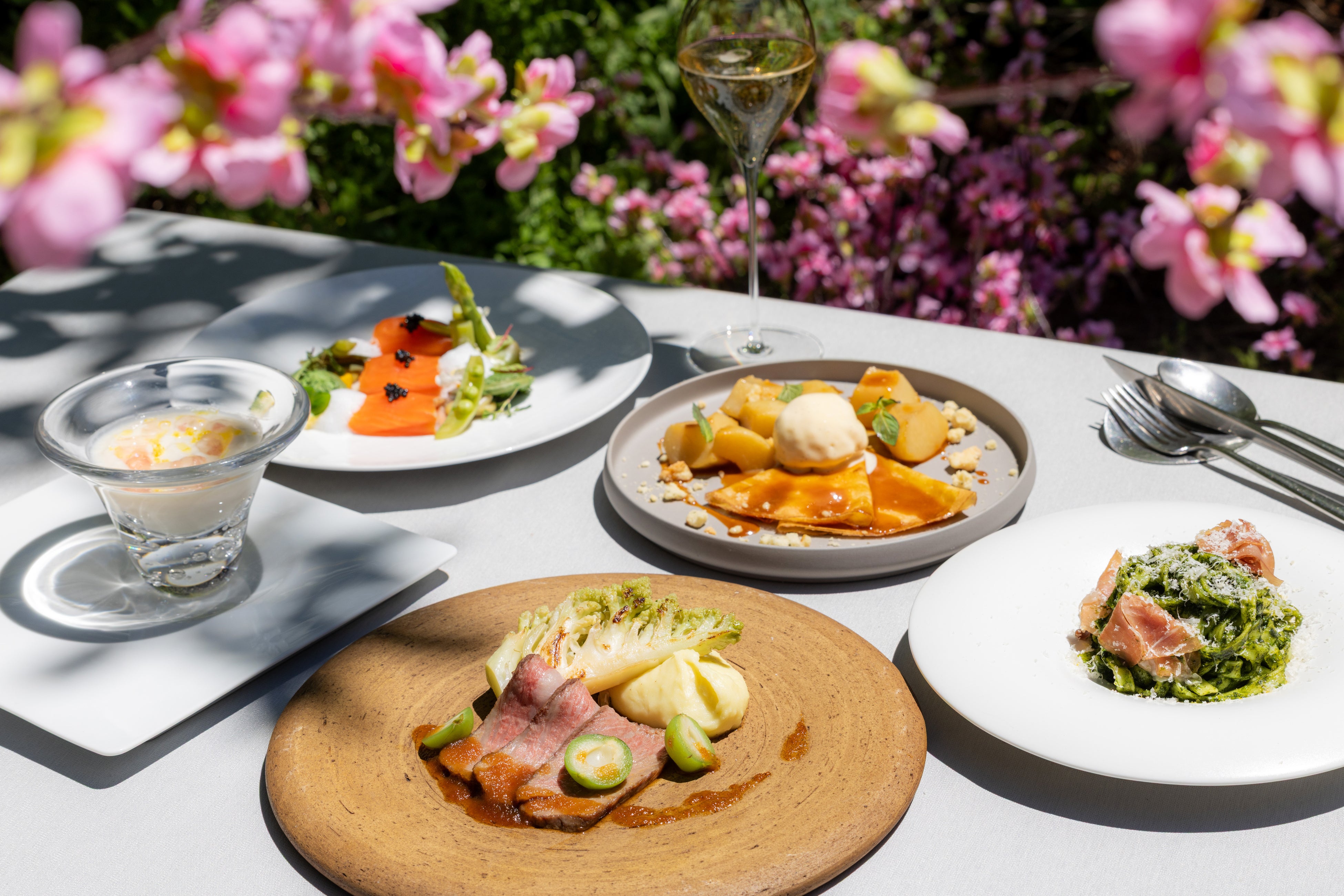 貸切の桃農園で味わうのは、桃の木の成長を「枝」「花」「葉」「若桃」「果実」の5つのシーンで表現したコースランチです。前菜に、桃の枝をチップにしての瞬間燻製、スープは桃の花のジャムを加えたソースで彩り豊かに仕上げます。メインディッシュでは、甘露煮にした若桃をソースに使用したローストビーフをご用意します。桃の成長に思いを馳せながら、それぞれの素材を活かした料理とワインペアリングを楽しむひとときです。