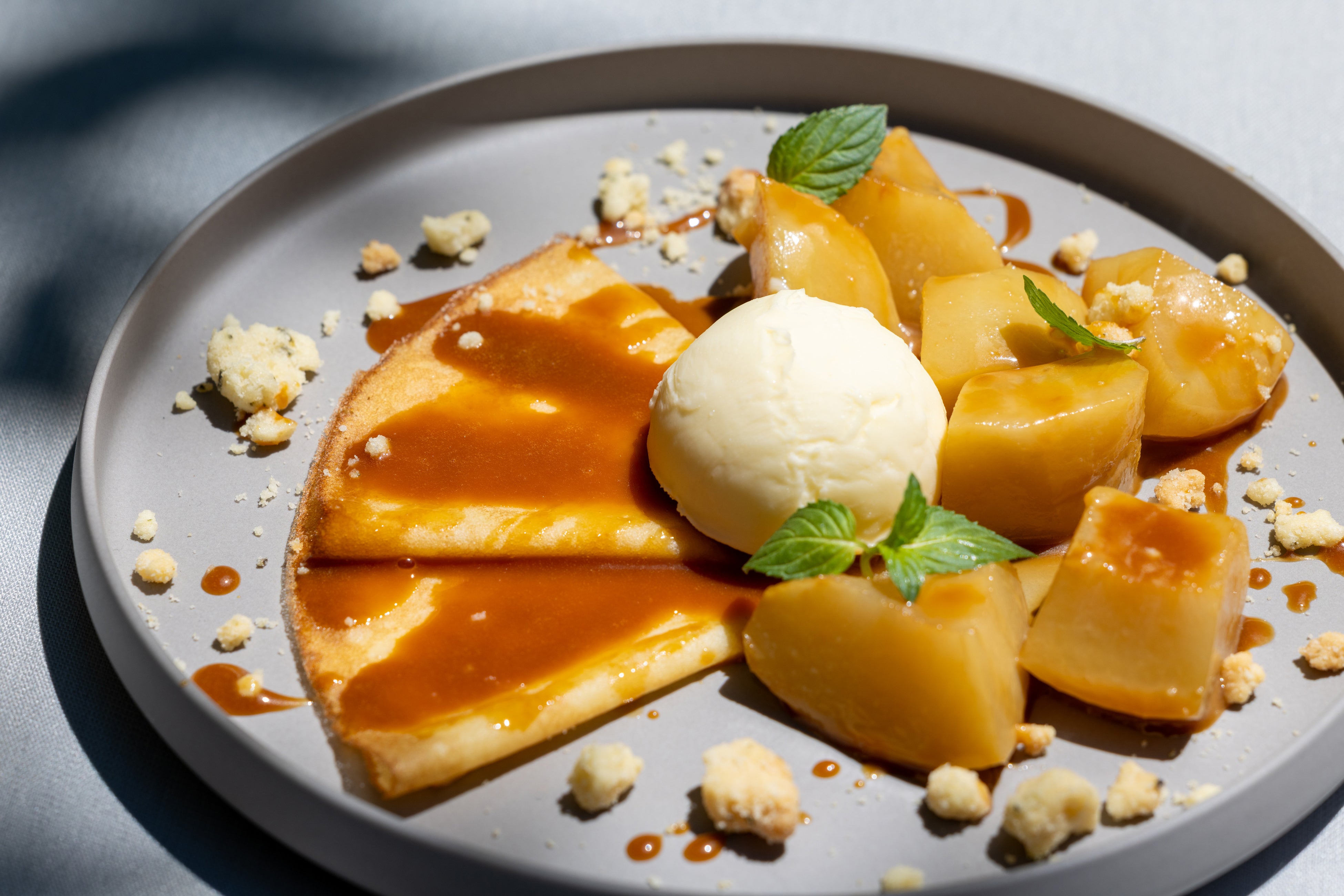 熱したフライパンにキャラメルソースと桃を入れ、目の前で仕上げる