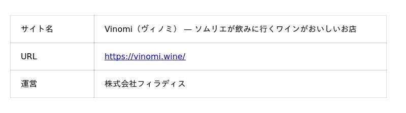 株式会社フィラディス(本社:神奈川県横浜市、代表取締役社長:石田大八朗)は、ワインを軸に“本当に満足できるお店”と出会える新しいレストランガイドサイト「Vinomi(ヴィノミ)」(https://vinomi.wine/)を本日公開いたします。