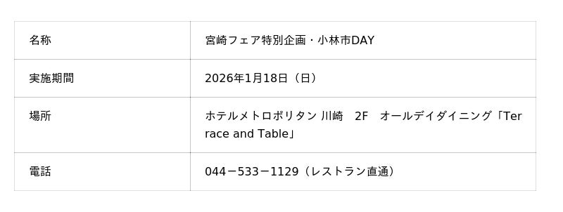 ホテルメトロポリタン 川崎(運営/日本ホテル株式会社、総支配人/金田 文典)が直営するオールデイダイニング「Terrace and Table」では2026年1月15日(木)~4月14日(火)の期間、宮崎県の食をビュッフェメニューにて提供する宮崎フェアを開催し、特に小林市と都農町の食をはじめとした魅力にフォーカスいたします。これに関連し、1月18日(日)にさらに小林市の食やワイン・本格焼酎などの魅力を存分にお楽しみいただける「宮崎フェア特別企画・小林市DAY」を開催することとなりました。