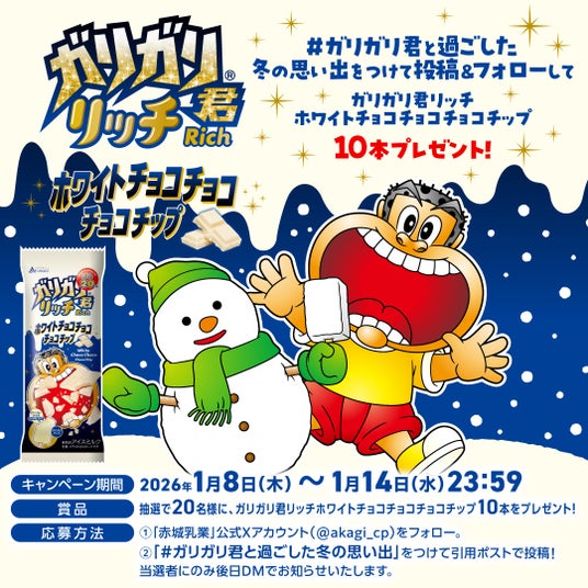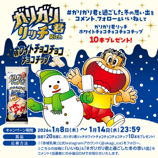また、20周年発売第1弾を記念して、2026年1月8日(木)~1月14日(水)の期間で、ガリガリ君リッチホワイトチョコチョコチョコチップ10本を合計で20名様にプレゼントするキャンペーンを赤城乳業公式X、Instagramで実施いたします。