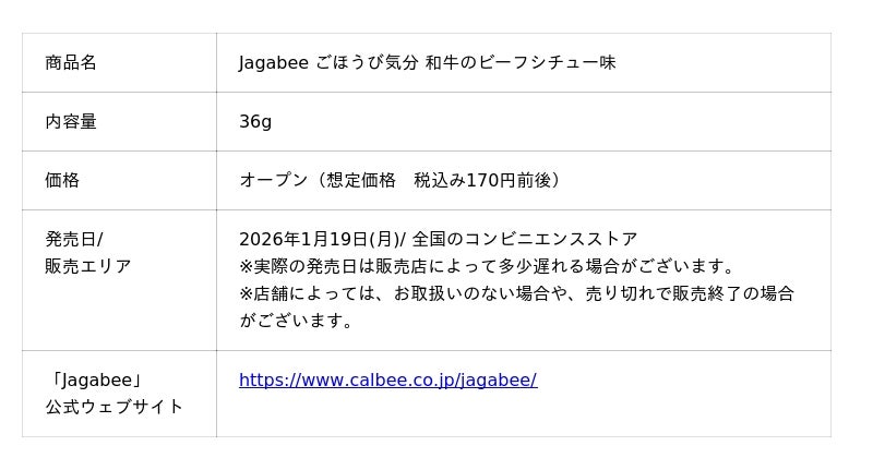 カルビー株式会社(本社:東京都千代田区、代表取締役社長兼CEO:江原 信)は、じゃがいもの味わいと独自の食感が楽しめる「Jagabee」より、新シリーズ「ごほうび気分」の第 2 弾商品として、濃厚デミグラスソースでじっくり煮込んだ和牛(※1)ビーフチューの味わいを再現した『Jagabeeごほうび気分 和牛のビーフシチュー味』を2026 年1 月 19 日(月)から、全国のコンビニエンスストア限定で発売します(同年 2 月下旬終売予定)