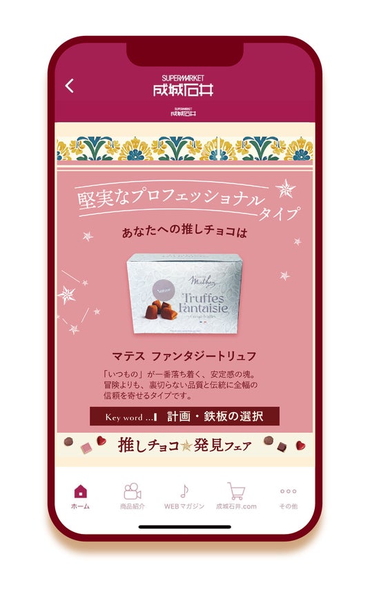 「推しチョコ★発見フェア」では、お客様が“推しチョコ”と出会い、心が満たされる“運命の一粒”を味わう特別なひとときをお届けするために、フェア開催期間限定の特別コンテンツをご用意します。公式アプリでは、お客様にぴったりな推しチョコをご提案する診断コンテンツ「推しチョコカルテ」を展開いたします。「あなたのチョコの好みの食感は?」などの4~5つの簡単な質問に回答していただくだけで、今の気分を表すキーワードとともに、お客様にぴったりなチョコをご提案いたします。また、店頭では冊子『私だけのご褒美チョコレート図鑑』を配布。各商品の味わいやおすすめのシーン、そしてドリンクとのペアリングを掲載いたします。さらに、成城石井の公式Instagramでは、フェア対象のチョコを毎日日替わりでご紹介いたします。これらのコンテンツを通して、お客様がまだ見ぬ“運命の一粒”と出会えるようにサポート。「推しチョコ★発見フェア」を通して、“推しチョコ”と出会う楽しさを体感いただくとともに、運命の一粒として味わう至福のひとときをご提案いたします。
