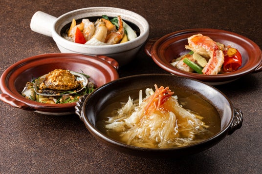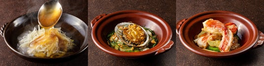 海のコラーゲンの上湯スープ 陶板煮込み/山口県産黒鮑の香味蒸し焼き 土鍋仕立て/タラバ蟹と葱生姜の土鍋炒め