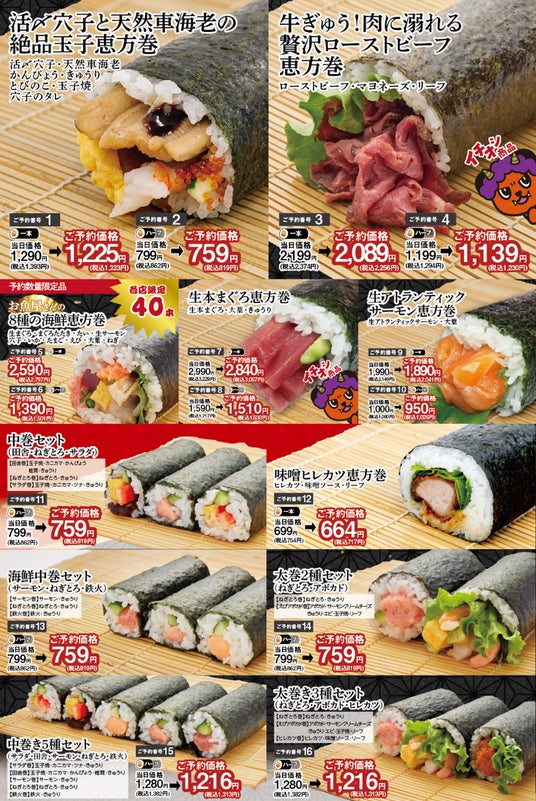 今年の恵方巻は、バリエーション豊富なラインアップをご用意しました!お魚好きな方からお肉好きの方、ご年配の方からお子さままで、皆さまに笑顔になっていただける商品を取揃えています。
