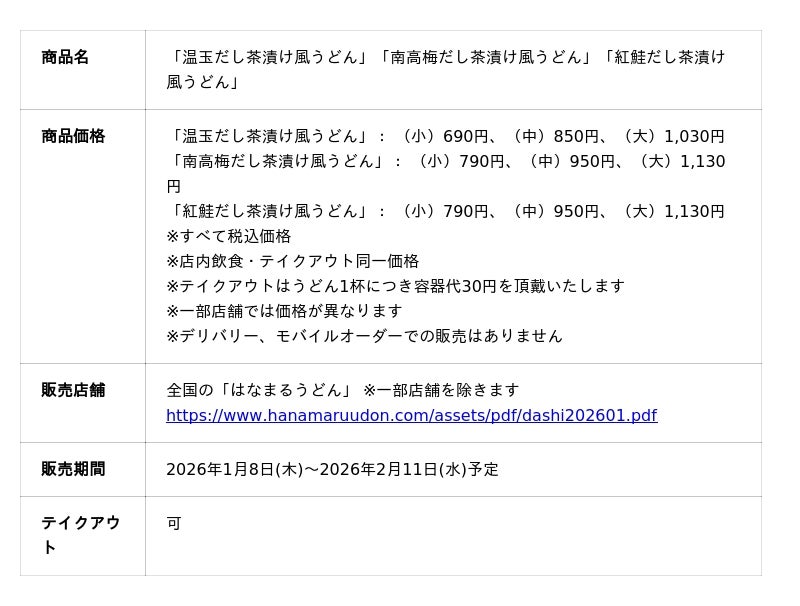 讃岐うどんチェーン「はなまるうどん」を展開する株式会社はなまる(本社:香川県高松市 代表取締役社長:前田良博、以下はなまる)は、2026年1月8日(木)より、全国(※一部店舗除く)のはなまるうどんにて、「温玉だし茶漬け風うどん」「南高梅だし茶漬け風うどん」「紅鮭だし茶漬け風うどん」を期間限定で販売いたします。