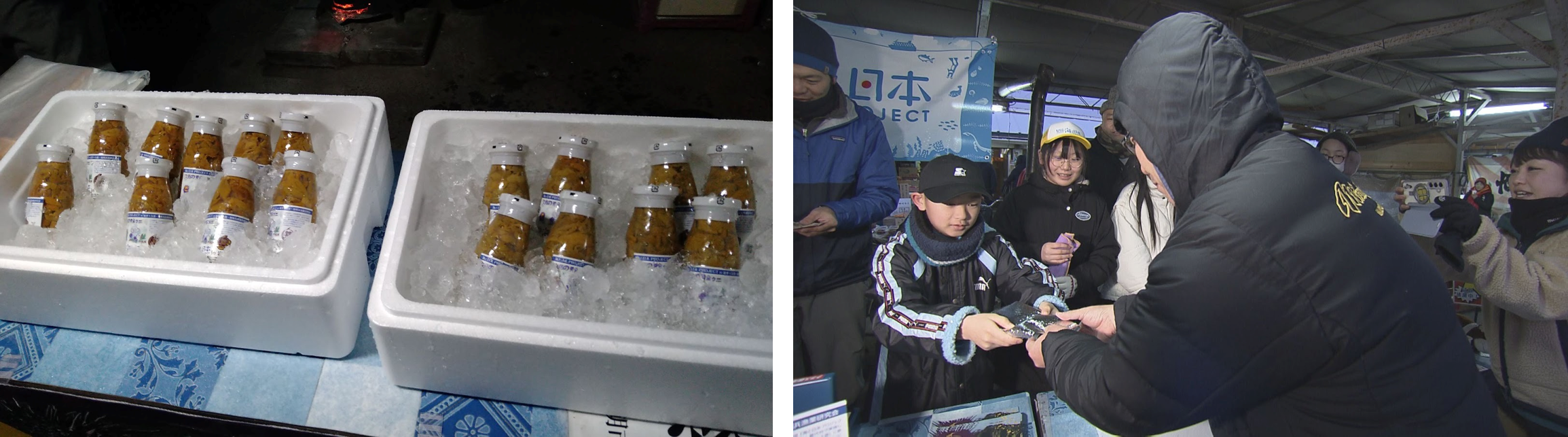 会場内のブースでは、「いわてマリンツアー2025 in 久慈」に参加した子どもたちが、早朝からマイナス6度という厳しい寒さにも負けず、元気にお客さんへ声をかけました。「ウニ」の美味しさはもちろん、学習を通して知った岩手の海について、来場者へ熱心に伝えました。また、スペシャルサポーターの「アンダーエイジ」さんも応援に駆けつけ、子どもたちと一緒に販売をお手伝い。子どもたちの熱心な呼びかけと、アンダーエイジさんの軽快なトークにより、販売会は大盛況となりました。 来場者は色鮮やかなラベルの「黄金雲丹」を手に取りながら、子どもたちの話に耳を傾け、岩手の海に想いを馳せていました。