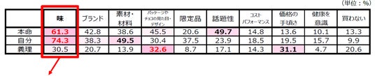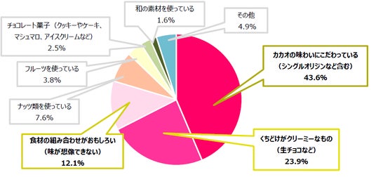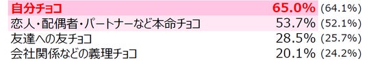 バレンタインの楽しみについて、「贈った相手が喜んでくれること」や「相手を想ってチョコを選ぶ時間」などをおさえて「自分へのご褒美として購入すること」が約6割という結果に。バレンタイン商戦が、従来の「贈り物」というイメージから、「自分が楽しむイベント」へと大きくシフトしていることが伺える。