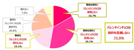 今年も引き続き物価高騰で節約志向がみられる中、昨年バレンタインチョコの値上げを感じた人は約65%という結果に。一方で、約72%は節約を意識せず、うち約17%はバレンタインチョコは奮発したいと回答。バレンタインチョコの値上げを感じながらも、普段は節約をしつつ、バレンタインチョコは好きなもの・食べたいものを買いたいという「メリハリ消費」の傾向が伺える。
