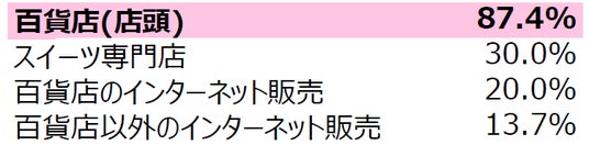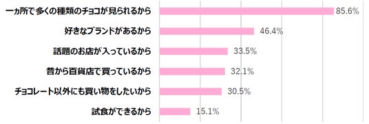 バレンタインチョコを百貨店で購入すると答えた人は約87%で、その理由として「一カ所で多くのチョコが見られるから」と答えた人が約86%にのぼった。実店舗での購入体験が重視されていることが分かる。また、百貨店のバレンタイン会場でイートインを利用したことがある人は約38%で、「利用したことがないが気になる」と回答した人を合わせると、約6割がバレンタイン会場でのイートインへの関心があるという結果に。チョコを買うだけでなく、その場で楽しむ「体験消費」の傾向が高まっている。