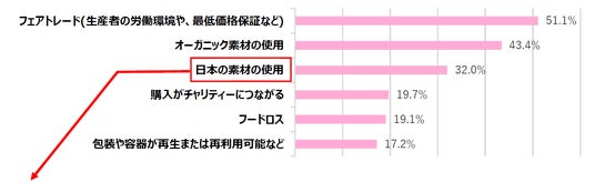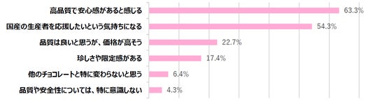 サステナブルな取組みについて、「フェアトレード」に関心がある人が約51%と過半数を超えている。国産素材に注目するチョコレートブランドが増える中、本アンケートでも「オーガニック素材の使用」や「日本の素材の使用」も上位にあがっており、消費者の素材へのこだわりも伺える。また、国産のチョコレートに対しては、「高品質」「安心」「生産者応援」など、ポジティブに捉えている人が多いことが分かった。