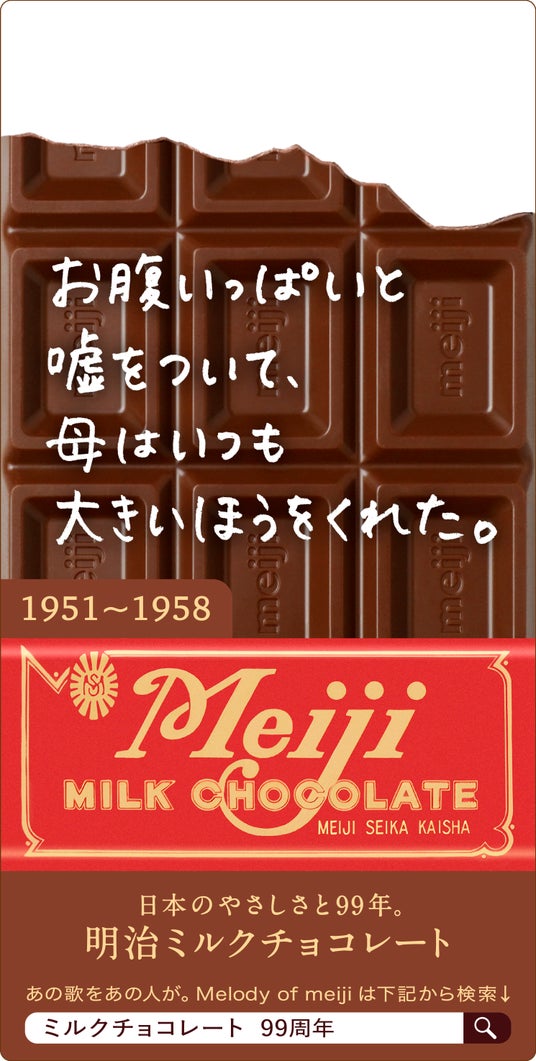 大正、昭和、平成、令和。時代がどれだけ変わっても、変わらないものがあります。それは、一枚のチョコレートが割られる時、そこには、やさしさが生まれているということ。あげる人がいて、もらう人がいて、笑顔が生まれているということ。「明治ミルクチョコレート」の99年は、そんな、やさしさのそばにあるやさしさを届け続けた99年。これからも、私たちは、感謝の気持ちを忘れずに、時代を超えて、世代を超えて、このやさしさのバトンを受け継いでいきます。