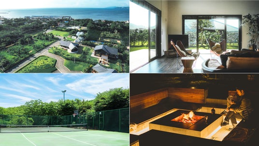 テニスコートとバスケットゴール付きの広大な貸別荘