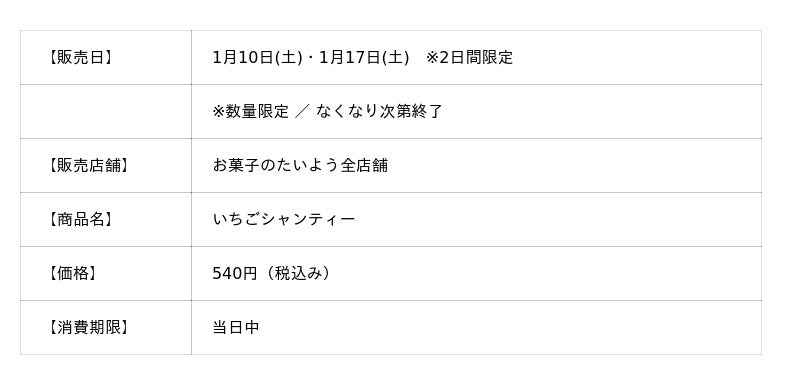 株式会社太陽社(所在地:千葉県匝瑳市飯倉293、代表取締役:片岡正裕)が展開する、千葉県で長年愛され続ける菓子店「お菓子のたいよう」は、希少な3Lサイズの銚子産とちおとめを使用した冬季限定スイーツ『いちごシャンティー』を、1月10日(土)・1月17日(土)の2日間限定で販売いたします。大粒苺をふわふわのシャンティークリームで包み、外側をパリッと薄いチョコレートでコーティングした本商品は、まるで“とろけるショートケーキ”をそのままかぶりつくような味わいが特徴。毎年リピーターが続出し、発売と同時に完売することも多い、「お菓子のたいよう」冬の名物スイーツです。