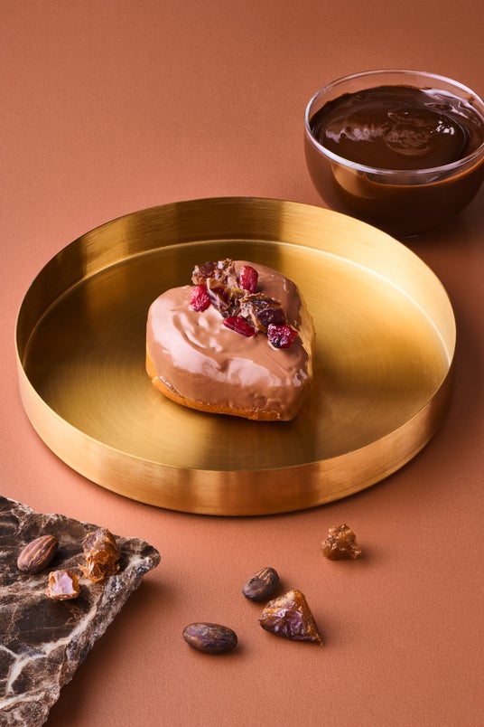カカオ80%の香り高くビターなチョコレートクリームをたっぷりと詰め、対照的なミルク感あふれるチョコレートに甘味とコクのあるデーツをトッピングしたハート型ドーナツ。チョコレートを練り込んだもちもちの生地に、濃厚なピスタチオのグレーズをかけ、上からフローラルな香りと力強いカカオを感じるチョコレートクリームを絞ったケーキのような大人のドーナツ。食感のアクセントになるよう刻んだホワイト&ダークチョコレートをトッピングした、4種類のチョコレートを堪能できるリッチなイーストドーナツ。選び抜かれた上質なチョコレートの魅力を存分に味わっていただける、満足度の高いラインアップに仕上げました。