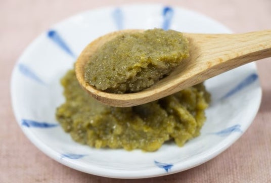 「木頭柚子 青ゆずこしょう」は、香りを最大限に活かすため、収穫後24時間以内に果皮処理を施し、塩分は最小限に抑えています。特別栽培木頭柚子(農薬・化学肥料不使用栽培)と、国産の低農薬栽培による青とうがらし、そして天日塩のみで作られ、青柚子の爽やかな香りが山むすびのアクセントになっています。