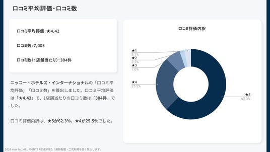 ニッコー・ホテルズ・インターナショナルの「口コミ平均評価」「口コミ数」を算出しました。口コミ平均評価は「★4.42」で、1店舗当たりの口コミ数は「304件」でした。