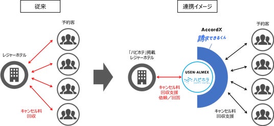USEN-ALMEXの「ハピホテ」を通じて成立した予約において発生したキャンセル料金を、USEN-ALMEXがAccordXの「請求できるくん」を通じて、本来レジャーホテルが自ら実施しなければならないキャンセル料金の収納を支援します。
