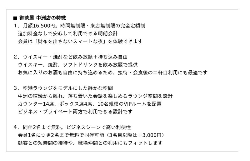 月額16,500円で時間無制限、来店無制限の完全定額制、飲み放題、お酒の持ち込み自由という独自システムにより、中洲に「静かに過ごす新しい夜の選択肢」を提供します。