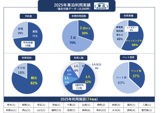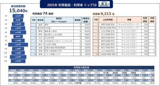 トラストパーク株式会社(本社:福岡県福岡市博多区、代表取締役:大津 忠芳)は、「第5回 日本サービス大賞」において「優秀賞」を受賞(※下部参照)したシェアリング・着地型観光DXサービス『車泊(くるまはく)』について、2025年度の年次利用実績データを公表いたします。本データは、自治体や観光事業者をはじめとする地域関係者が、受入環境の整備や滞在施策の検討を行う際の基礎資料として活用いただくことを目的としています。