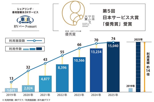 『車泊』の利用件数は、2019年の1,071件(13地域)から、2024年に13,234件(70地域)、2025年に15,040件(74地域)へと年々着実に増加し、2019年比で利用実績は約14倍に拡大しています。