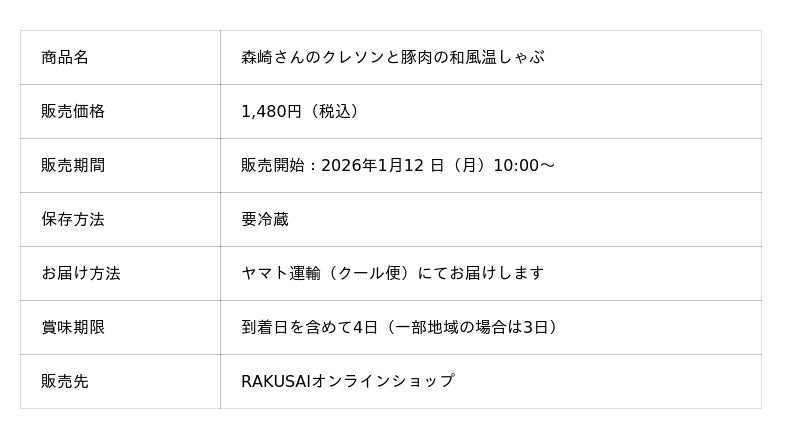 楽彩株式会社(本社:東京都足立区/代表取締役社長:大崎善保)は、“レジェンド生産者”の野菜を主役にしたミールキットシリーズより、冬の食卓に新しい彩りを添える『森崎さんのクレソンと豚肉の和風温しゃぶ』を1月12日(月)に新発売いたしました。