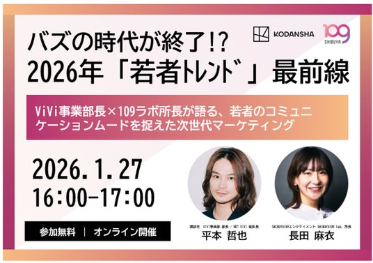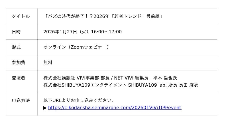 今般、Z世代を中心に高い発信力を持つファッション誌「ViVi」(発行:株式会社講談社)と連携し、SNSとリアルを掛け合わせた若年層向けプロモーション支援プランの提供を2026年1月より開始いたします。また、本プランの提供開始を記念して2026年1月27日に共同ウェビナー「バズの時代が終了!?2026年「若者トレンド」最前線」(参加費:無料)を開催いたします。