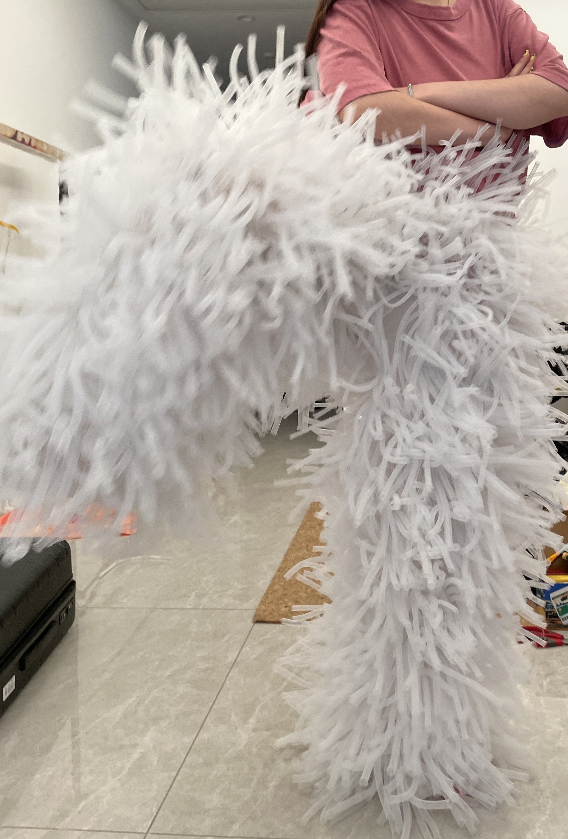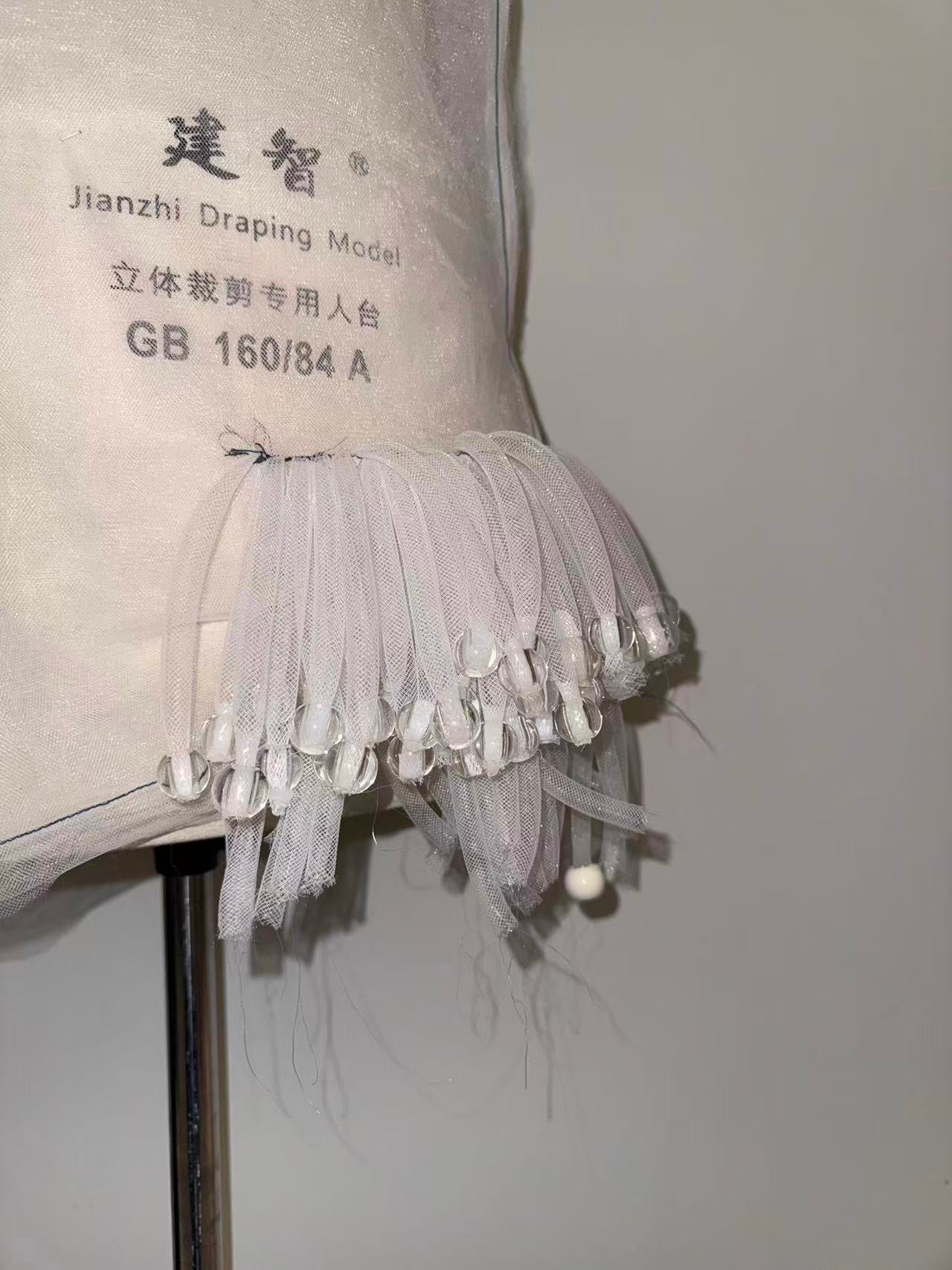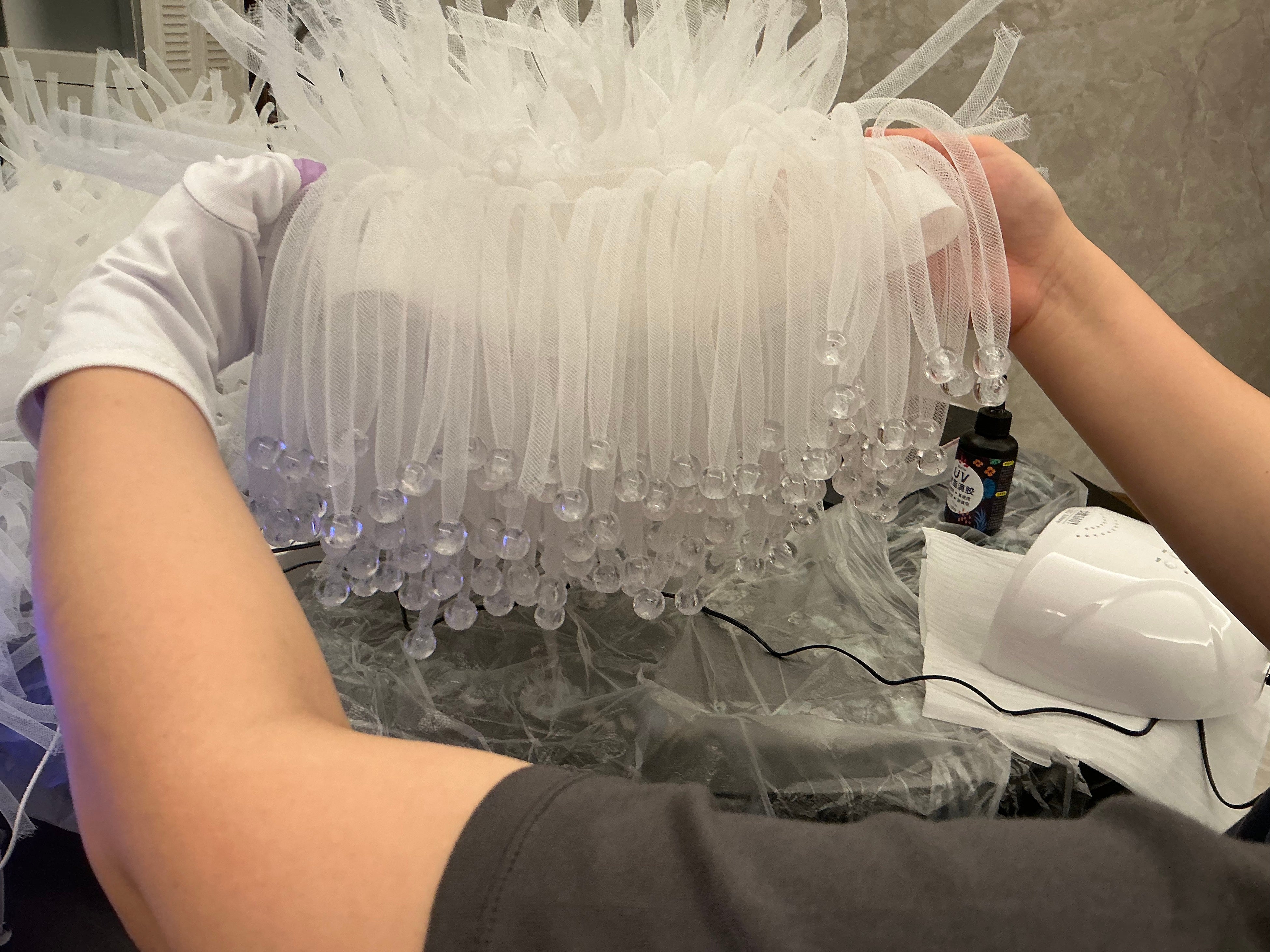 さらにチューブの先には重みのある透明なビーズを付け、ダイナミックなダンスの動きに応じ、多方面に反射する輝きを生み出した。