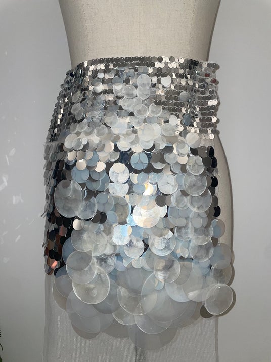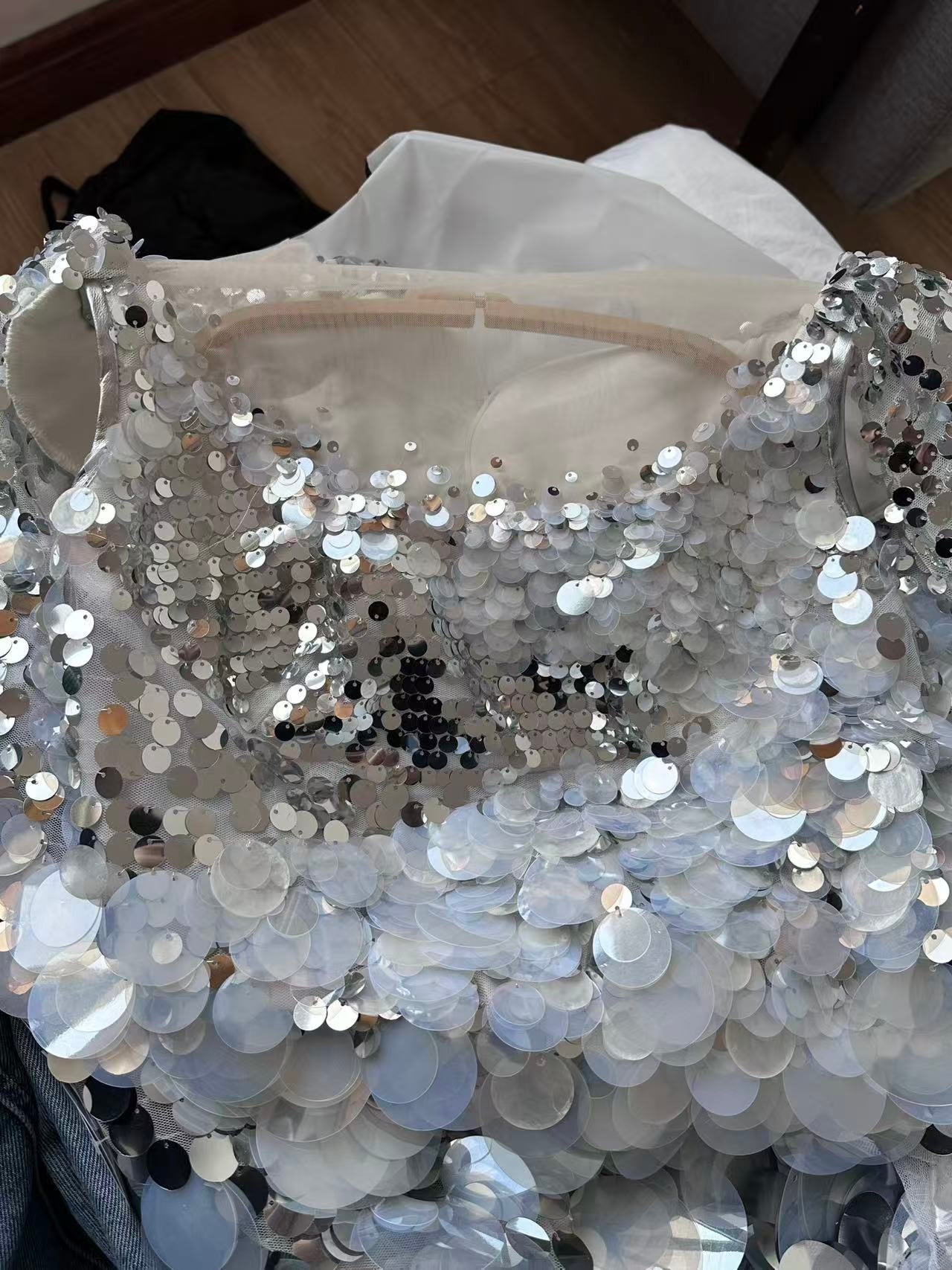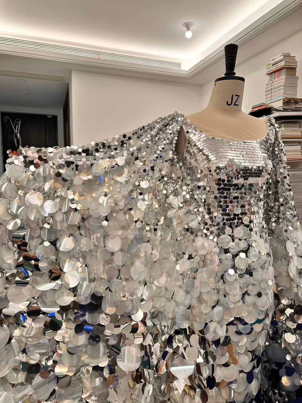 全身に縫い付けられたシルバーのスパンコールは胸元からつま先にかけてサイズを調整。シルバーの間に、半透明や貝のような質感の白のスパンコールも追加することで奥行きのあるグラデーションを生み出した。