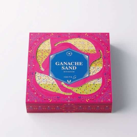 ■商品名:ガナッシュサンドカカオニブがアクセントのガナッシュに、イシヤオリジナルホワイトチョコレートとフィリングを積み重ね、サブレでサンドしました。