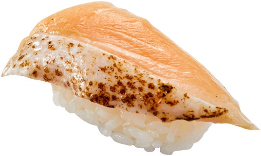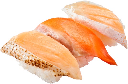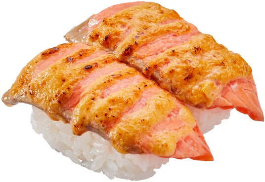 とろける食感が楽しめる「とろっと焼きサーモンハラス」、不動の人気を誇る「大切りサーモン」、脂の濃厚な旨みを楽しめる「とろサーモン」を一度に楽しめます。