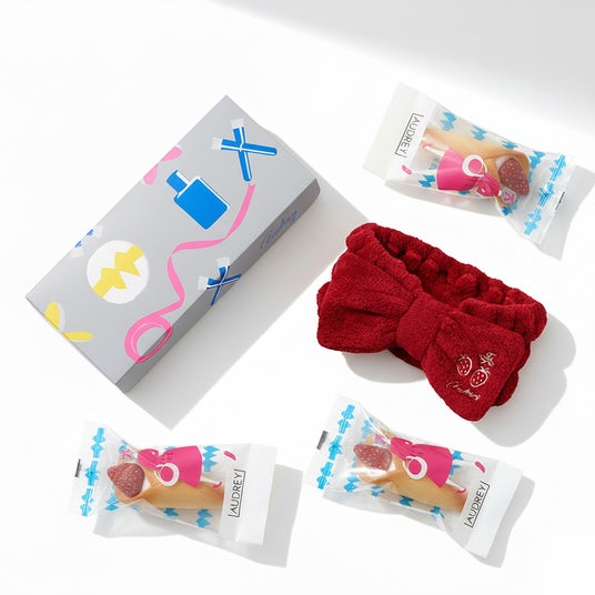 苺のワンポイントがついた大きなリボンが目を惹くヘアターバンと、グレイシアミルクのセットです。