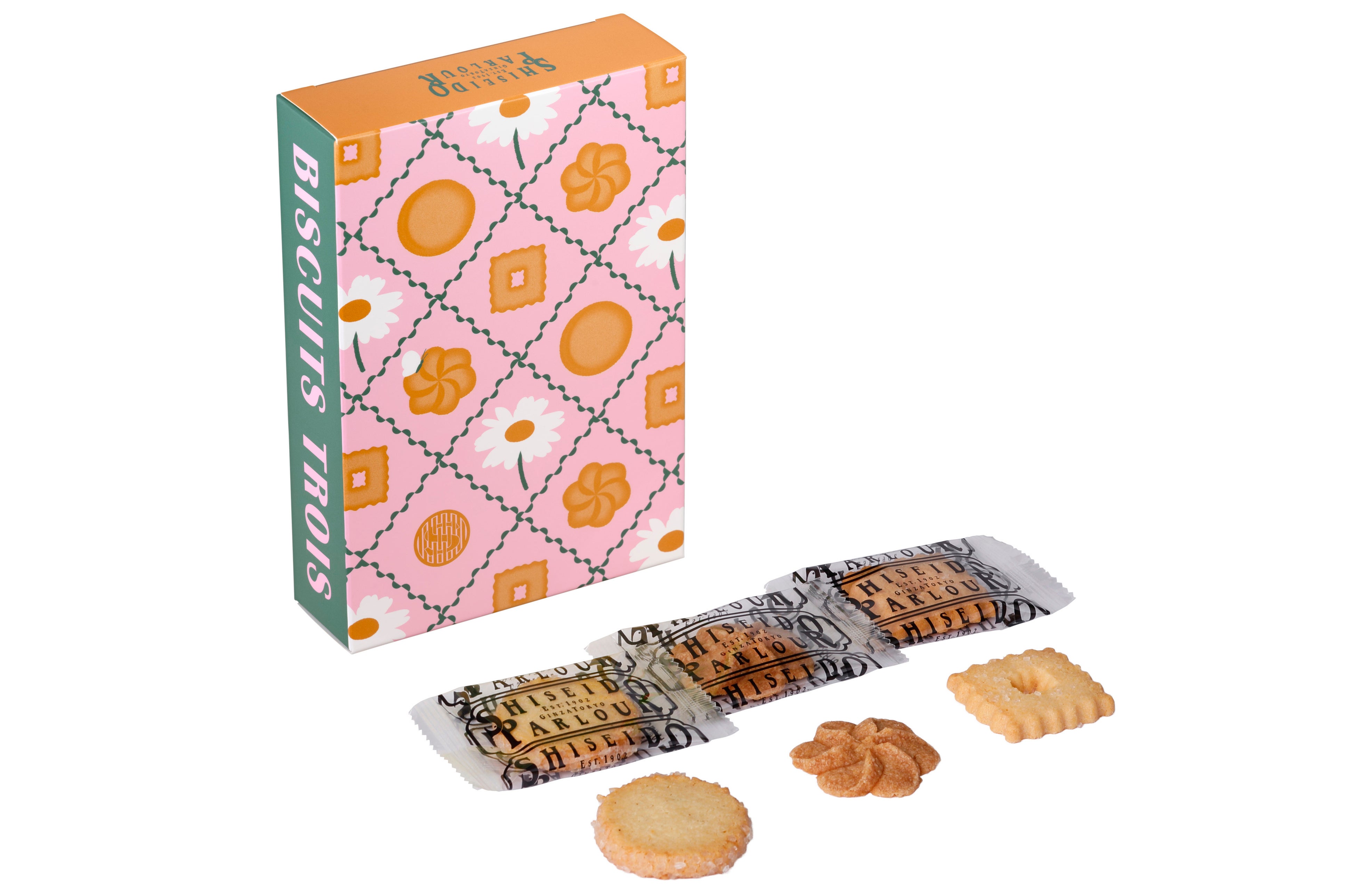 ノスタルジックな印象のデザインには、ふっと笑みがこぼれる遊び心も。「ビスキュイ トロワ」には蝶々が、「マカロンフレーズ」にはうさぎが、それぞれパッケージのどこかに描かれています。