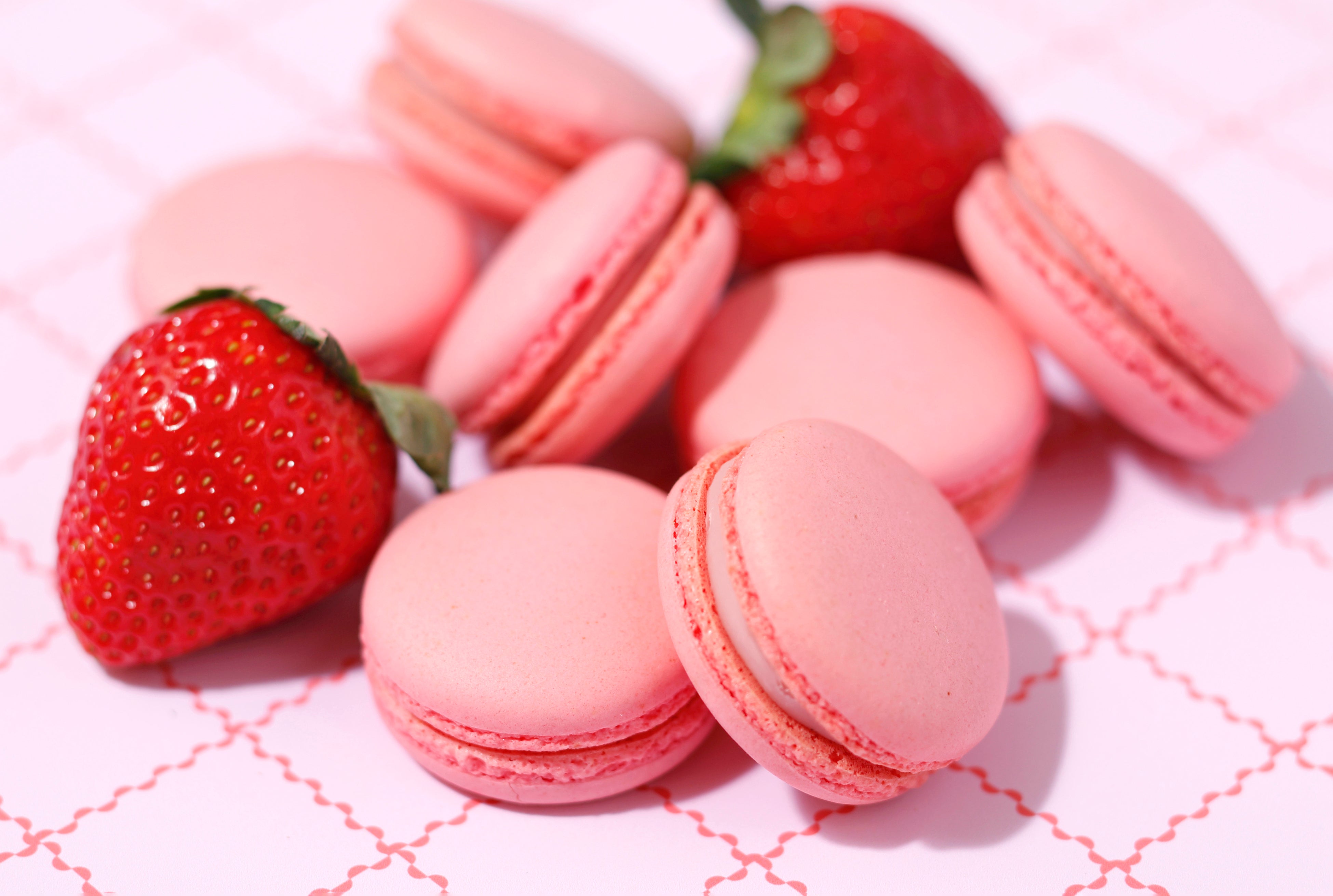 メレンゲに砂糖、アーモンドプードル、福岡県産あまおう苺のピューレを加えた生地を焼き上げ、あまおう苺ピューレとバニラビーンズ入りのバニラペーストを合わせたクリームをサンドしました。外側はさくっと、中はしっとりした食感が特長です。甘くやさしい芳醇な香りをお楽しみいただけます。