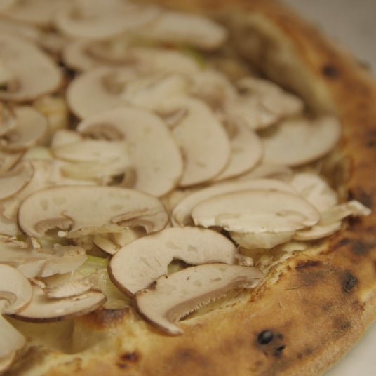 看板メニューのピザは玉ねぎとマッシュルームの水分だけで仕上げた自家製デュクセル(※)を使用。焼き上げたあとに、生のマッシュルームを極薄にスライスして重ねることで、火を入れた旨味と、生の香りが重なる一枚に仕上げています。