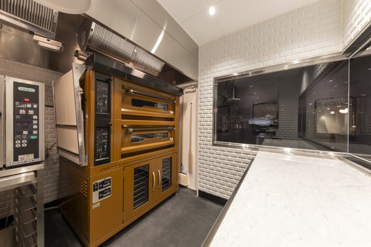 カウンター席の奥は厨房機器を完備。正面右手の本格ベーカリーオーブン前はガラス張りで、仕込みや焼き上がりの様子をご覧いただけるようにデザインしています。