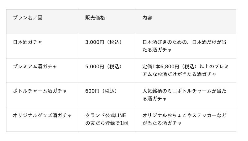 ※クランドでの販売定価を基準として、必ず酒ガチャ1回の体験金額以上の価格のお酒が当たります。