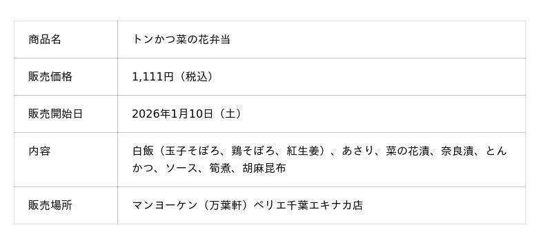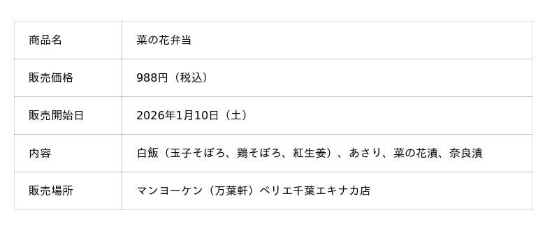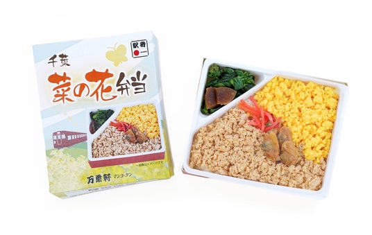 株式会社リエイグループの株式会社リエイが展開する千葉県の老舗駅弁ブランド「マンヨーケン(万葉軒)」(本社:千葉県浦安市、代表取締役 椛澤 一)は、発売から60年目の節目に「菜の花弁当」をリニューアルし、2026年1月10日(土)より販売を開始いたしました。 千葉県の県花「菜の花」の畑をイメージした鮮やかな彩りはそのままに、味わいや素材の魅力をより引き立てる逸品に仕上げています。鶏そぼろは粒をより大きくし肉感をアップ。付け合わせには菜の花を採用いたしました。さらに、老舗佃煮店「いかだ焼本舗 正上」のあさり串は、串をなくすことでより食べやすく工夫。また、掛け紙のデザインも一新し、年代を問わず幅広いお客様に手に取っていただけるよう、親しみやすくいたしました。