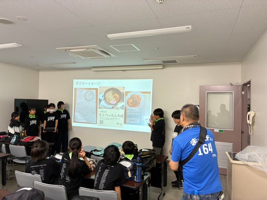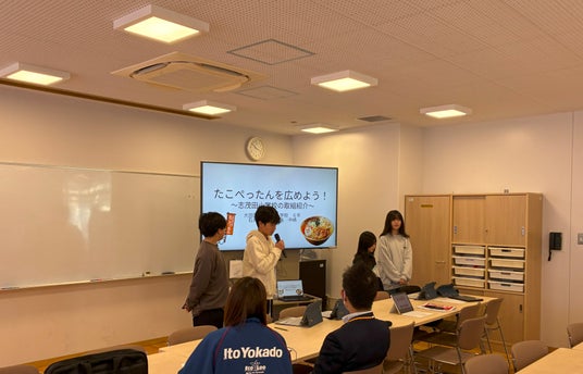 「たこぺったんそば」を販売するために必要となるチラシやポスターなどの子どもたちから提案内容を議題に販促に向けた具体的な内容も意見交換。その後には、実際に給食で「たこぺったん」を試食し一番人気の給食メニューを実感。