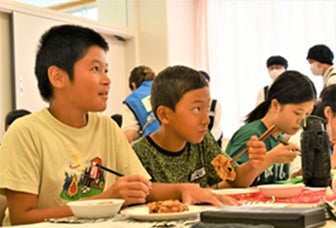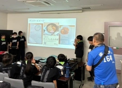 児童たちと「たこぺったんそば(うどん)」の販促物に関する意見交換を実施。