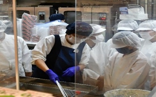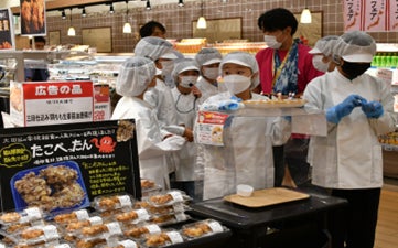 志茂田小学校の児童がイトーヨーカドー大森店にて「たこぺったん」を作る様子を見学。店内放送や試食販売で「たこぺったん」の売り込みを体験。