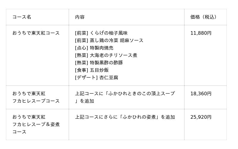 ご宿泊のお客様は SHIKI -HAKONE- のために作られた東天紅の専用オンラインショップを通じて、以下の特別コースを事前に注文できます。商品はSHIKI -HAKONE-の施設へ直接配送されるため、お客様はチェックイン後すぐに本格的なディナーをお楽しみいただけます。