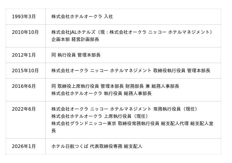古澤 聡は、1993年に株式会社ホテルオークラへ入社。国内外のホテルやグループ本部での運営管理経験をもとに、グランドニッコー東京 台場 取締役常務執行役員 総支配人代理を経て、このたび、ホテル日航つくばおよびホテルJALシティつくばの総支配人に就任する運びとなりました。