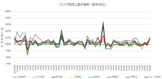 - 12月売上における、前年対比の伸長率(地方平均)は102.6%と前月から1.4pt増加した。各地域の売上伸長率は、中部地方が最も高く前年対比103.6%となった。
