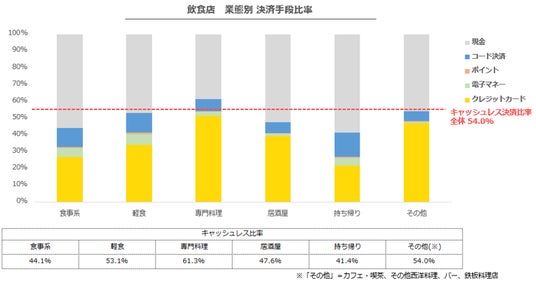 - 業態別にキャッシュレス比率を見ると、すべての業態で40%を超える。またコード決済比率が一番高い「持ち帰り」では、その割合が14.7%であった。