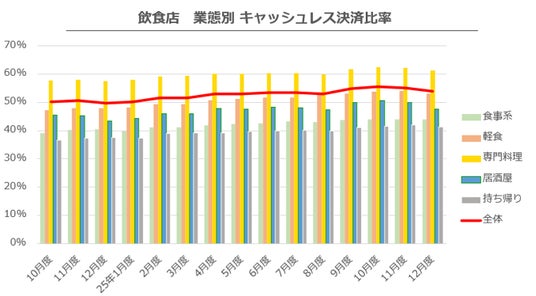 - 業態別にキャッシュレス決済比率をみると、11月度から12月度にかけて、軽食以外の業態で減少した。業態の中で最もキャッシュレス決済比率の高い専門料理は、61.3%と前月から0.8pt減少した。